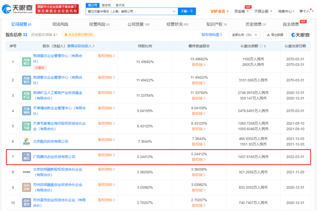 天眼查 App 显示,12 月 30 日,爱芯元智半导体(上海)有限公司发生工商变更,原股东之一特利迦(北京)企业管理有限公司退出,新增股东广西腾讯创业投资有限公司等;企业注册资本增至约 2.74 亿人民币,增幅 10.6% 。据官网显示,爱芯元智为 AI 视觉芯片研发及基础算力平台公司。(36氪报道)