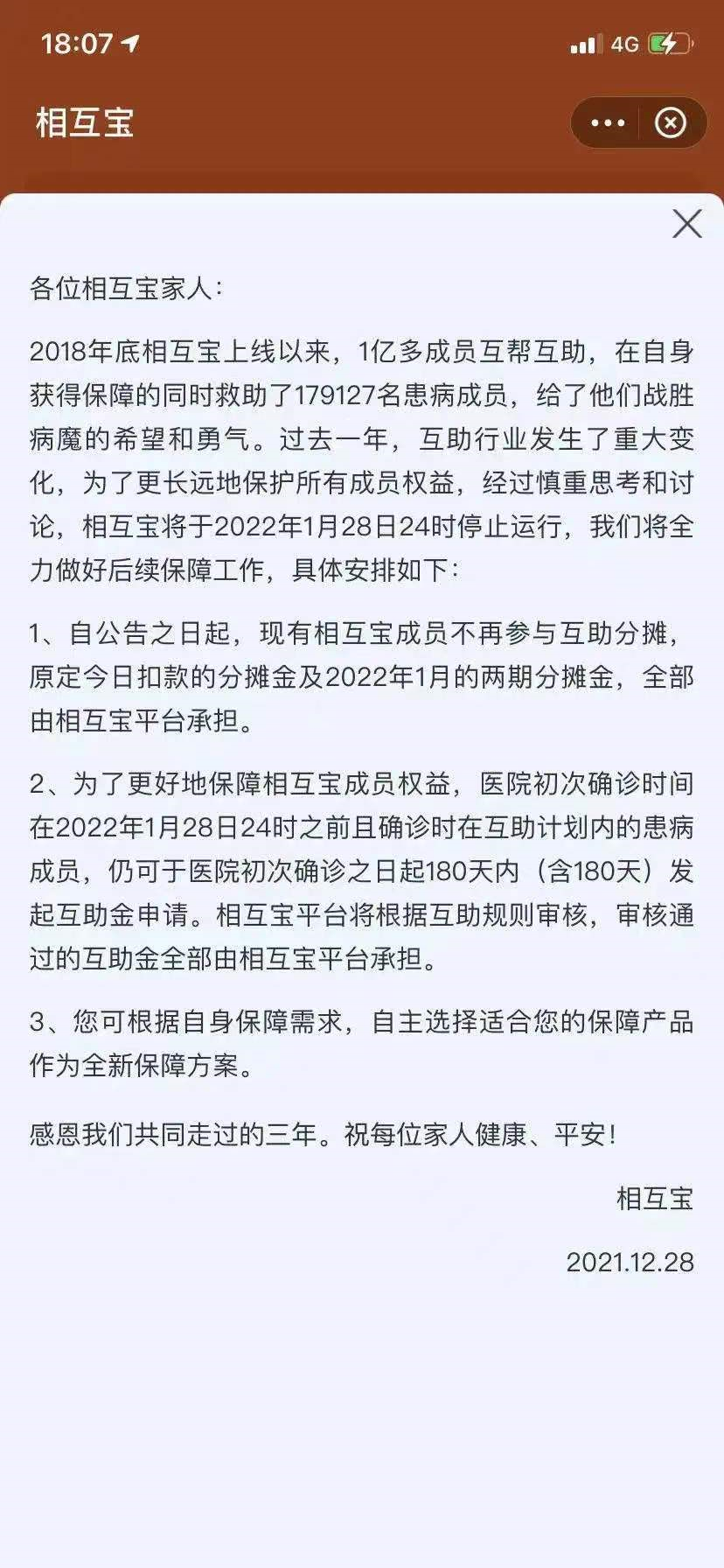 12 月 28 日,支付宝小程序相互宝发布公告,互助计划将于 1 月 28 日正式停运。