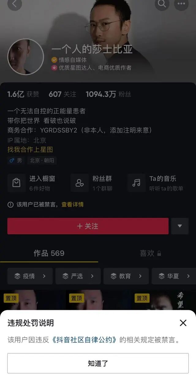 2.千万粉丝账号“一个人的莎士比亚”遭抖音禁言、快手禁播
